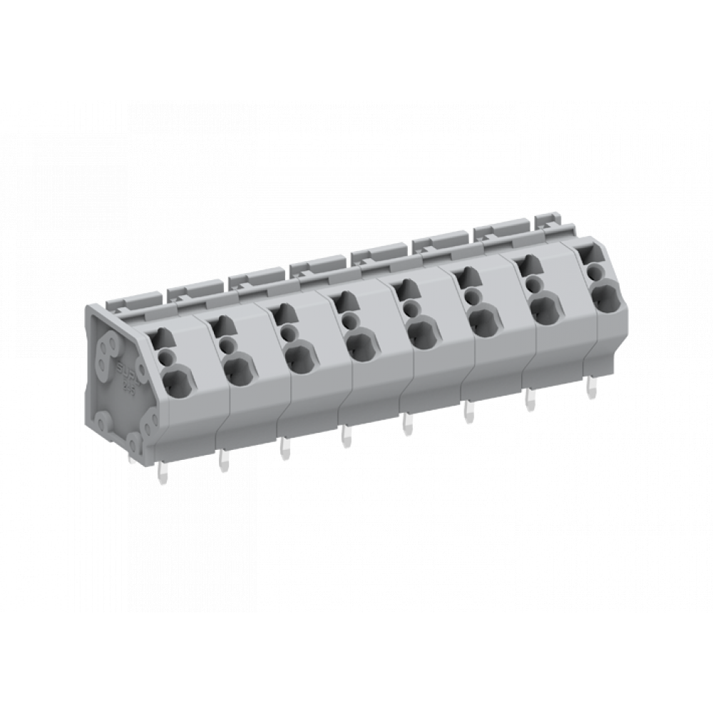 Клемма на плату 245402, Клемма, подвод кабеля 45 град., на плату, шаг: 10 мм, 2 полюса, фиксация провода Push-in, исполнение: два вывода на полюс, 1000V, 32A, цвет: серый