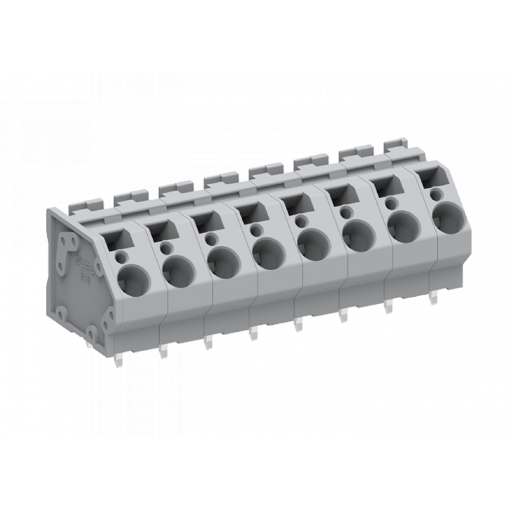 Клемма, подвод кабеля 45 град., на плату, шаг: 10 мм, 1 полюс, фиксация провода Push-in, исполнение: два вывода на полюс, 1000V, 41A, цвет: серый
