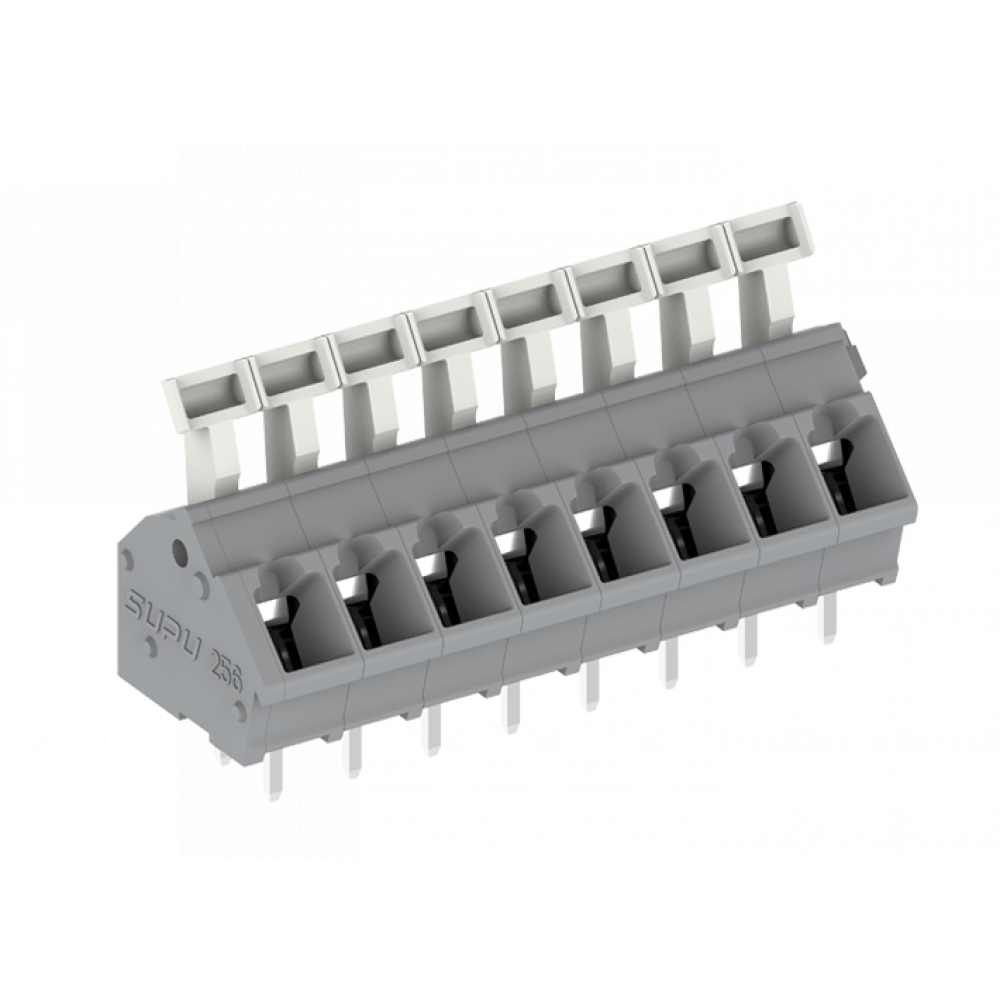 Розеточный разъем на плату 256303, Клемма, подвод кабеля 45 град., на плату, шаг: 5.0 мм, 3 полюса, фиксация провода Push-in, исполнение: два вывода на полюс, рычажный зажим, 320V, 24A, цвет: серый