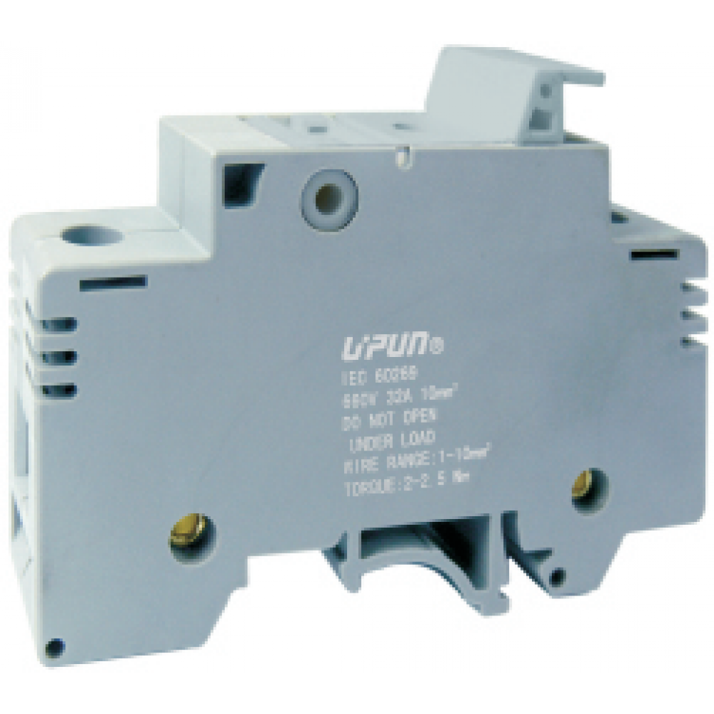Предохранительная клемма, тип предохранителя: 10x38, тип фиксации провода: винтовой, номинальное сечение: 10 мм кв., до 32A, 1000V, ширина: 17,5 мм, цвет: серый, тип монтажа: DIN35