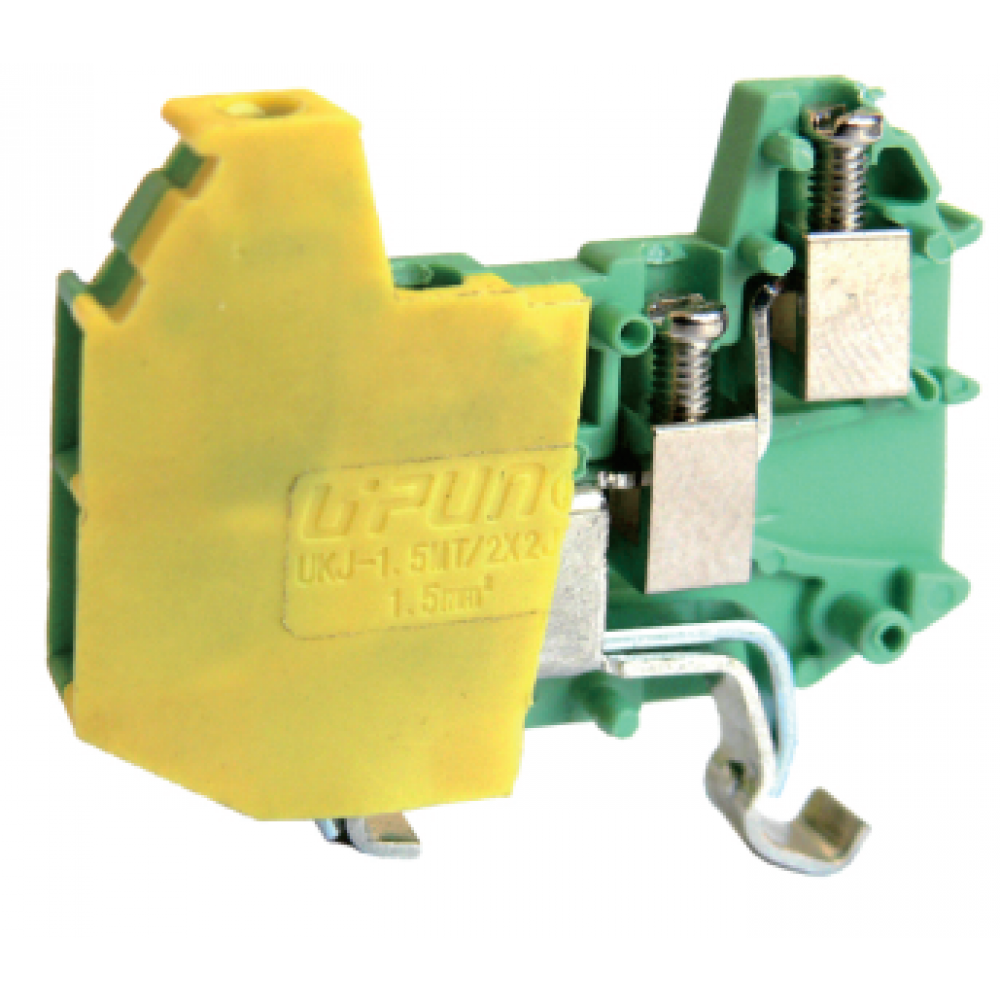 Заземляющая клемма (MINI) UKJ-1.5MT/2X2JD, Заземляющая клемма, MINI, боковой подвод кабеля, 4 точки подключения, тип фиксации провода: винтовой, номинальное сечение: 1,5 мм кв., 400V, ширина: 4,2 мм, цвет: желто-зеленый, тип монтажа: DIN35