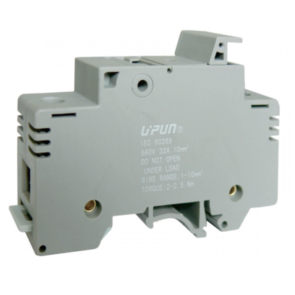 Предохранительная клемма, тип предохранителя: 10x38, тип фиксации провода: винтовой, номинальное сечение: 10 мм кв., до 32A, 1000V, ширина: 17,5 мм, цвет: серый, тип монтажа: DIN35