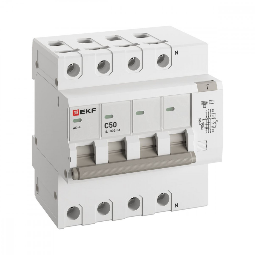 Описание Дифференциальный автомат АД-4 50А/300мА (хар. C, AC, электронный) 6кА EKF PROxima