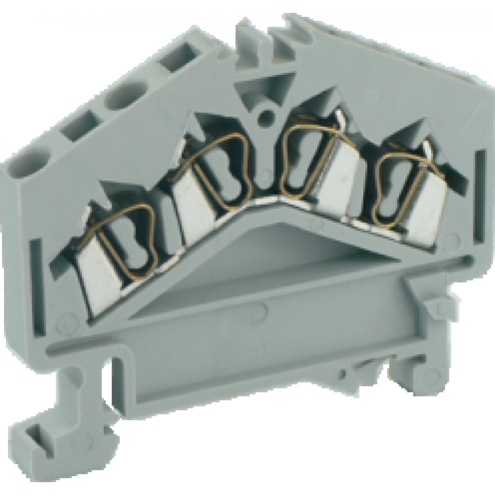 Проходная клемма, угловая, 4 точки подключения, тип фиксации провода: пружинный, номинальное сечение: 2,5 мм кв., 24A, 800V, ширина: 5 мм, цвет: серый, тип монтажа: DIN35