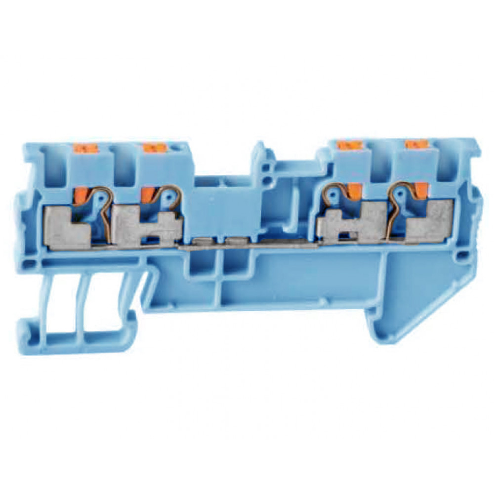 Проходная клемма, 4 точки подключения, тип фиксации провода: Push-in, номинальное сечение: 1.5 мм кв., 17,5A, 500V, ширина: 3,5 мм, цвет: синий, тип монтажа: DIN35, втычная перемычка,