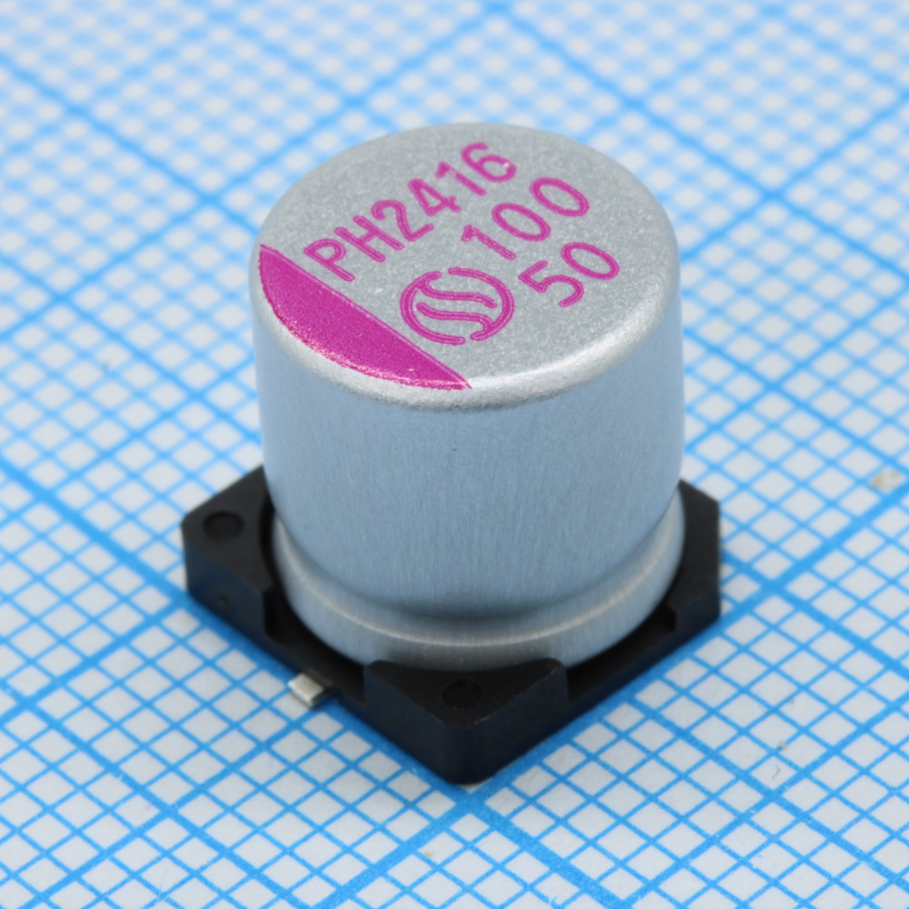 PH050M101GABPKKKV00R, Конденсатор алюминиевый полимерный 100мкФ 50В ±20% (10 X 12.7мм) для поверхностного монтажа 0.03Ом 2300мА 20000час 105°С лента на катушке