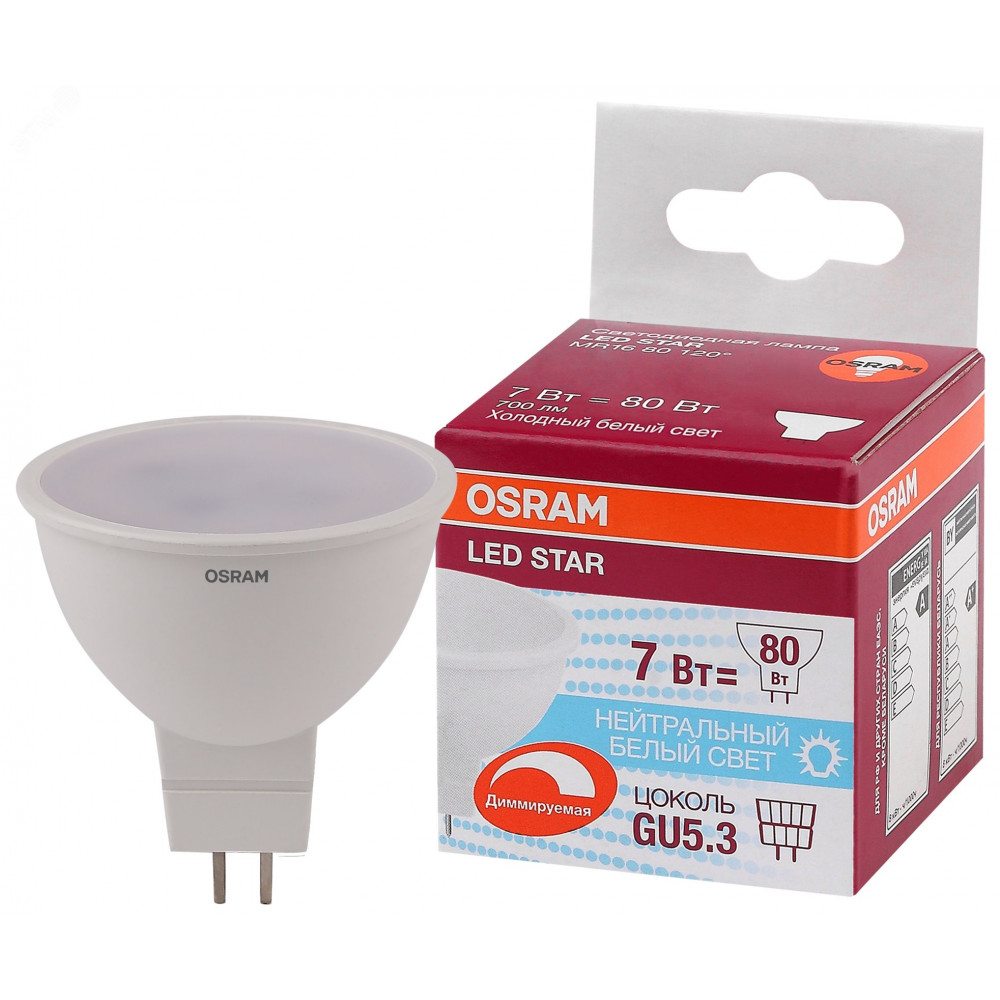Лампа светодиодная LED 7Вт GU5.3 MR16 110 град. (замена 80Вт) белый, диммируемая OSRAM 4058075229037, Лампа светодиодная