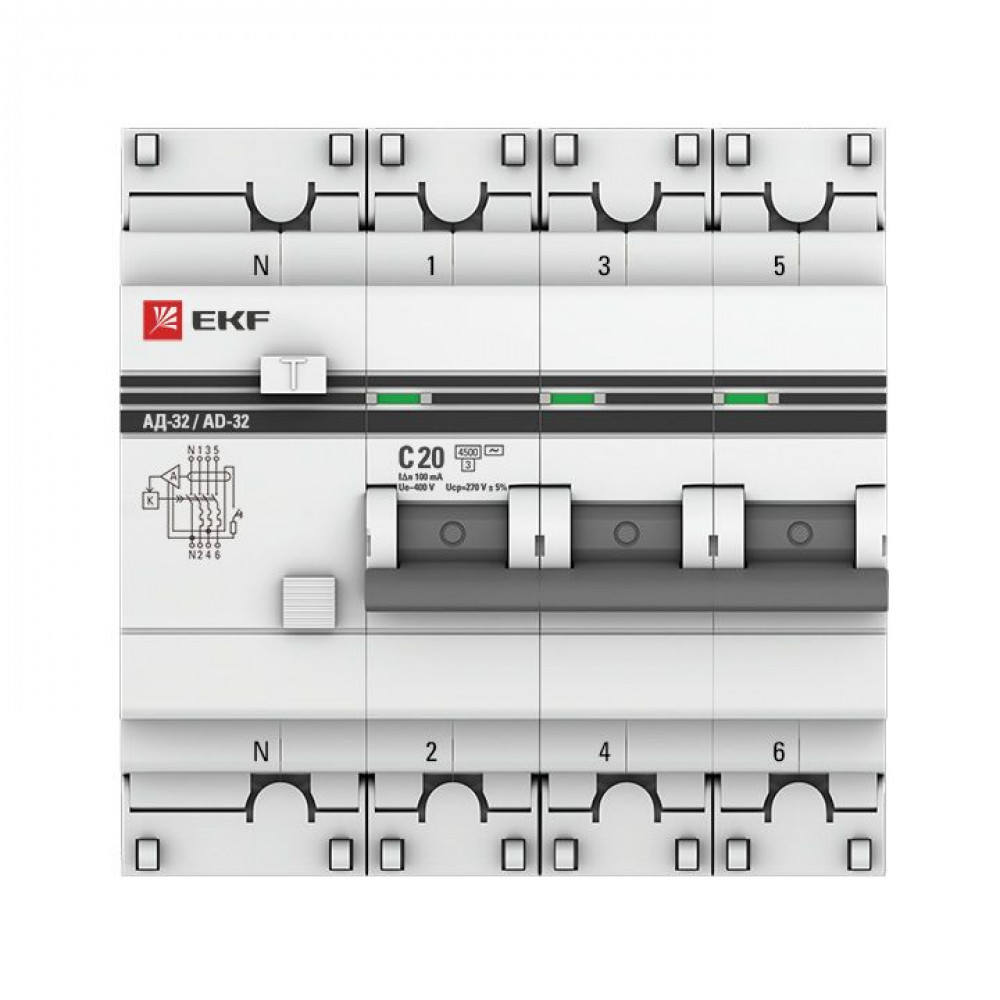 Описание Дифференциальный автомат АД-32 3P+N 20А/100мА (тип АC) 4,5кА EKF PROxima
