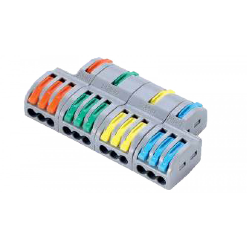 Рычажная клемма, разветвительная, с монтажными фланцами, 4 x 1 входа, 4 x 3 выхода, сечение проводника 0,08 - 4,0 мм кв., 250V, 32A, цвет корпуса: серый, цвет рычагов:оранжевый, зеленый, желтый, синий