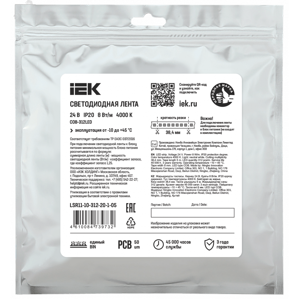 Описание Лента LED 5м COB-312LED 8Вт/м IP20 8мм 24В 4000К IEK LSR11-10-312-20-1-05