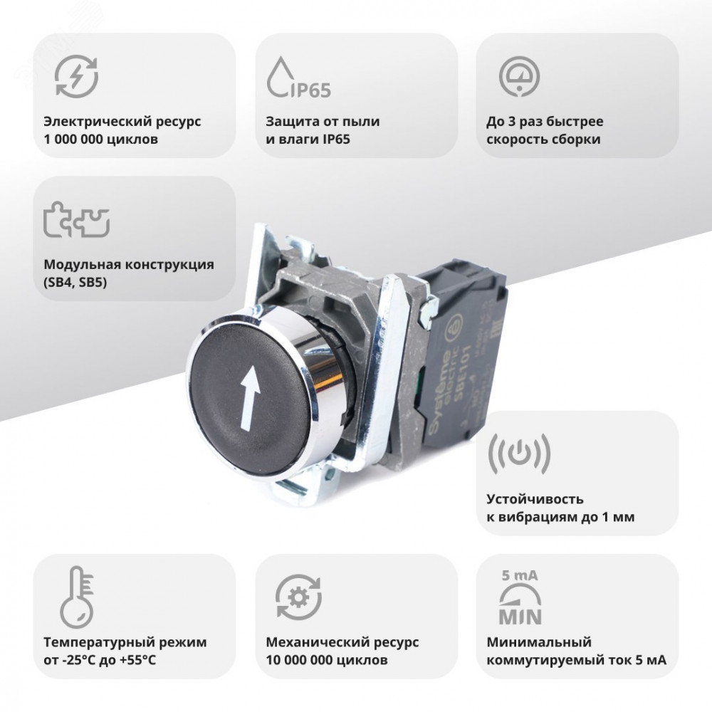 Описание Кнопка SB4 в сборе модульная 22мм черная металл 1НО с марк стрелка вниз SB4BA3351