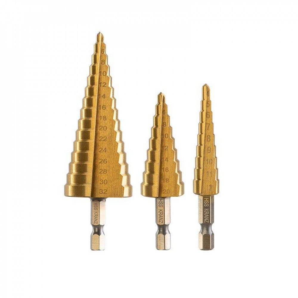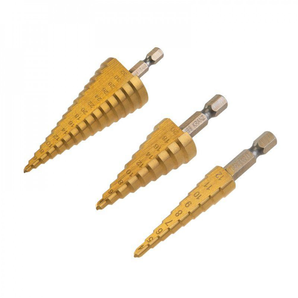 Описание Набор ступенчатых сверл, 4-12,4-20,4-32мм, HSS-TiN, ТИТАН, 3 шт. KR-12-6620