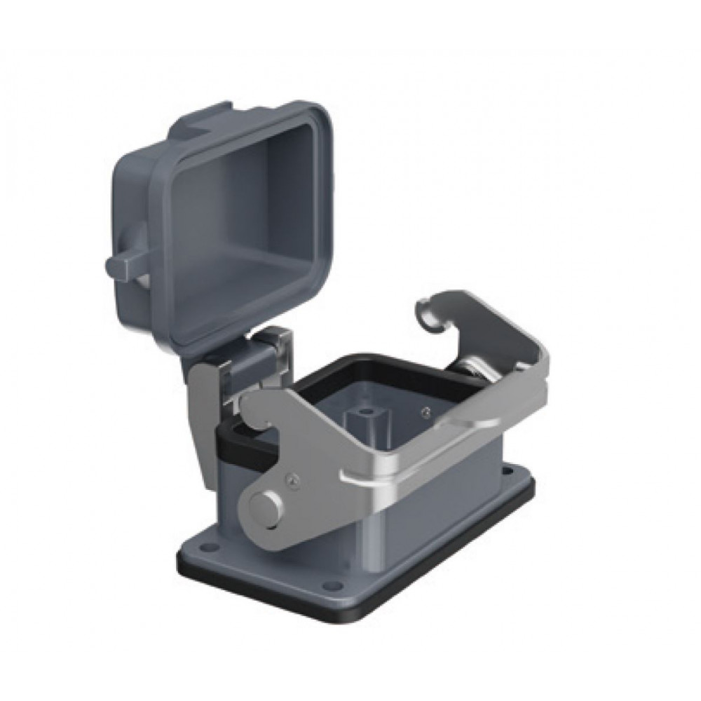 Открытое основание разъема H6B-OM-1L-PC, Основание разъема на панель, открытое, типоразмер 6B, с уплотнителем, с одной металлической защелкой, с пластиковой защитной крышкой, материал корпуса: алюминиевый сплав