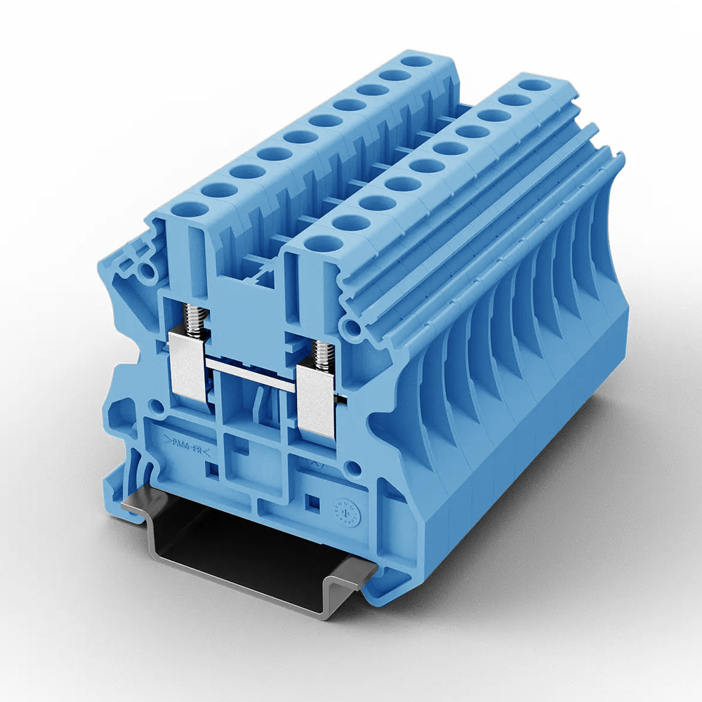 Проходная клемма, тип фиксации провода: винтовой, номинальное сечение: 4 мм кв., 32A, 800V, ширина: 6,2 мм, цвет: синий, тип монтажа: DIN35, винтовая перемычка, зажимная клетка: латунь