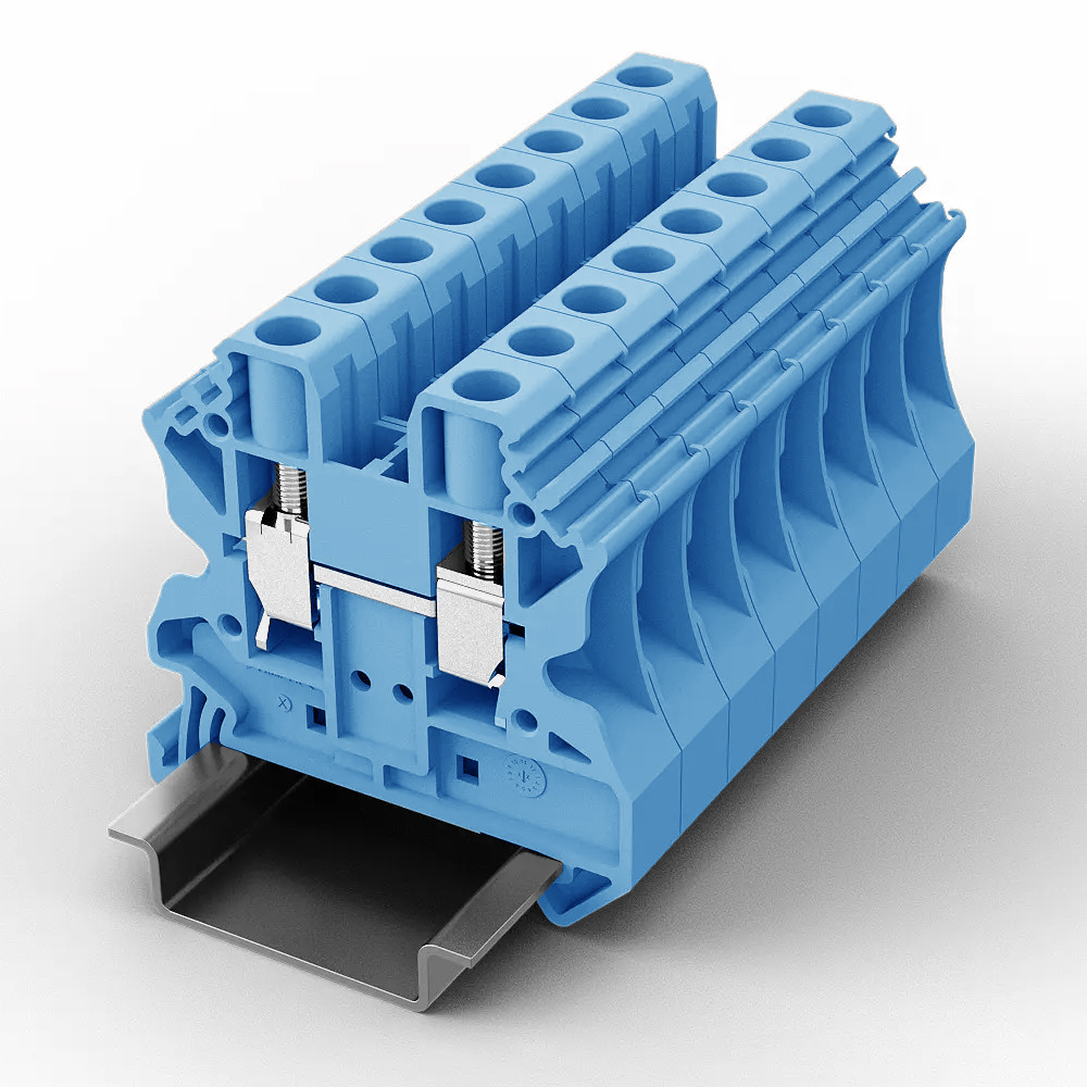 Проходная клемма, тип фиксации провода: винтовой, номинальное сечение: 6 мм кв., 41A, 800V, ширина: 8,2 мм, цвет: синий, тип монтажа: DIN35, винтовая перемычка, зажимная клетка: латунь