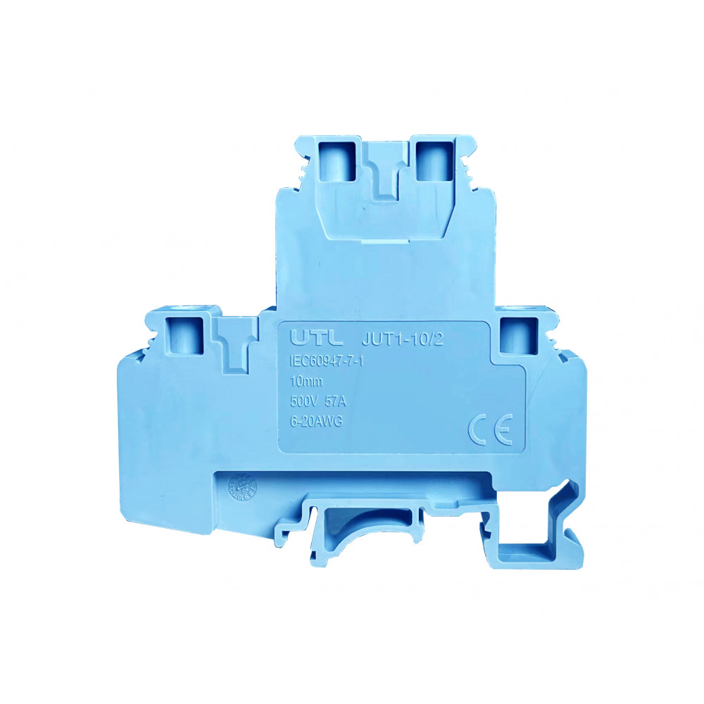 Этажная клемма JUT1-10/2-BE, Этажная клемма, 2 этажа, тип фиксации провода: винтовой, номинальное сечение: 10 мм кв., 57A, 500V, ширина: 10,2 мм, цвет: синий, тип монтажа: DIN35