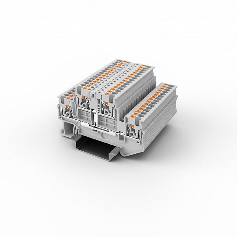 Этажная клемма, 2 этажа, межэтажное соединение, тип фиксации провода: Push-in, номинальное сечение: 1,5 мм кв., 16A, 500V, ширина: 3,5 мм, цвет: серый, тип монтажа: DIN35