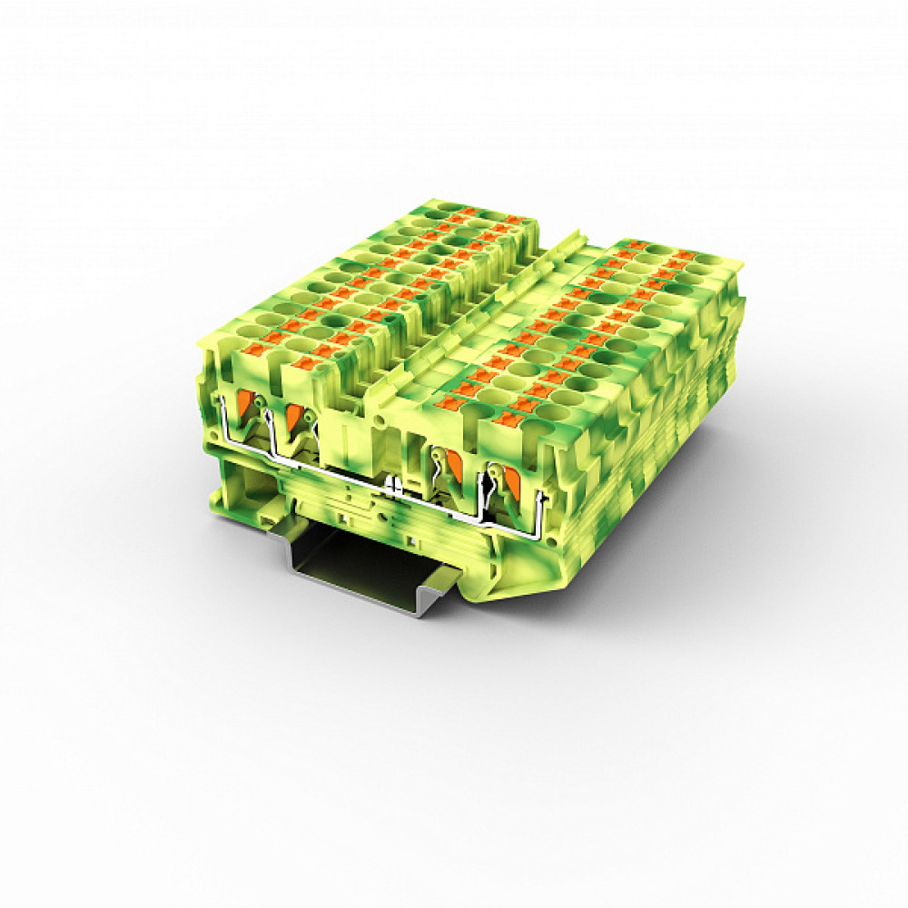 Заземляющая клемма, 4 точки подключения, тип фиксации провода: Push-in, номинальное сечение: 2,5/4 мм кв., 800V, ширина: 5 мм, цвет: желто-зеленый, тип монтажа: DIN35