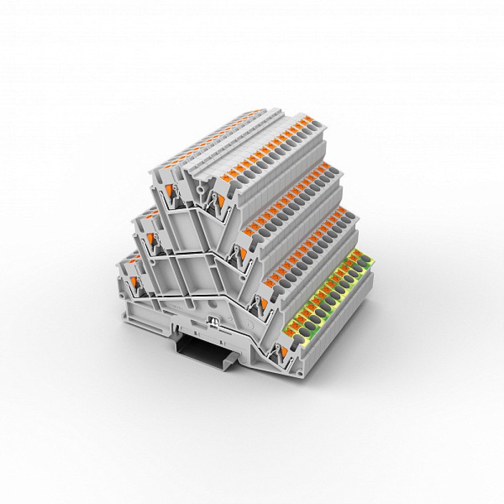 Этажная клемма, 3 этажа, тип фиксации провода: Push-in, номинальное сечение: 2,5 мм кв., 22A, 500V, ширина: 5,2 мм, цвет: серый, тип монтажа: DIN35