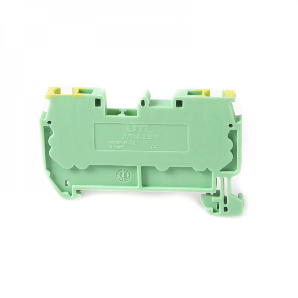 Доставка Заземляющая клемма JUT14-2.5PE , Заземляющая клемма, тип фиксации провода: пружинный, номинальное сечение: 2,5 мм кв., 800V, ширина: 5,2 мм, цвет: желто-зеленый, тип монтажа: DIN35