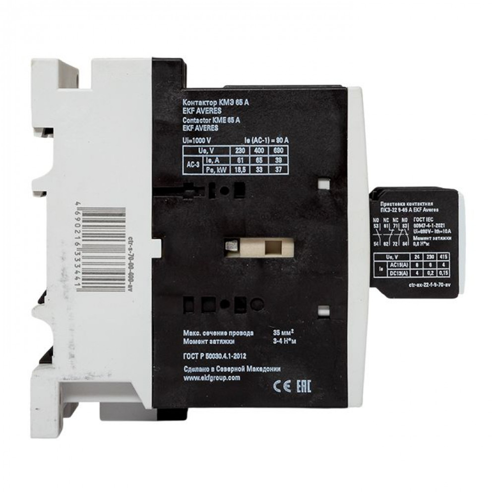 Описание Комплект КМЭ 65А 400В АС с дополнительными контактами 2НО+2НЗ EKF AVERES ctr-s-70-00-400-av-22