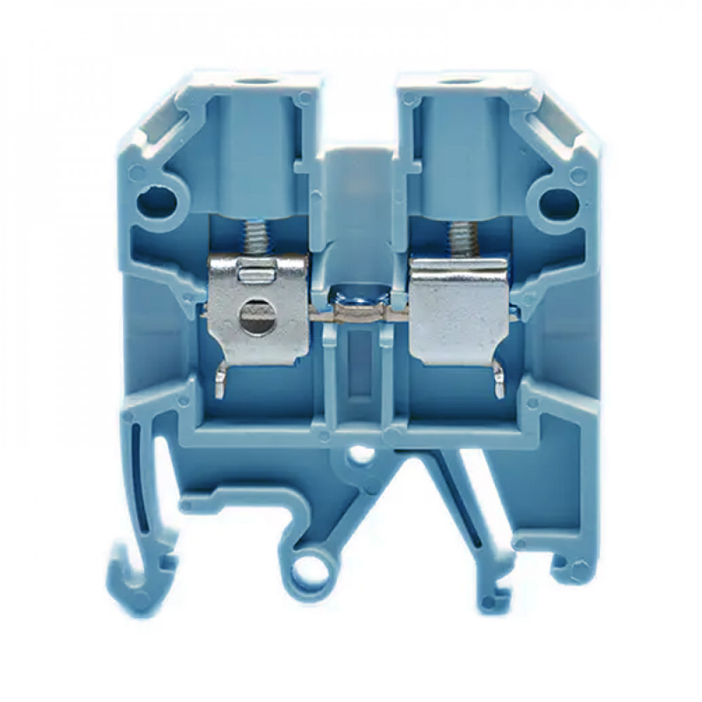 Проходная клемма, тип фиксации провода: винтовой, номинальное сечение: 4 мм кв., 32A, 800V, ширина: 6,2 мм, цвет: синий, тип монтажа: DIN35, винтовая перемычка, зажимная клетка: латунь