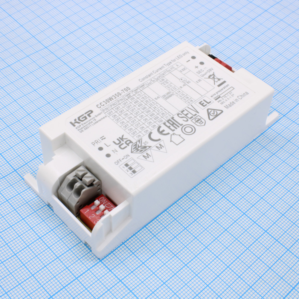 CC30W350-700, AC-DC, 30Вт, LED драйвер, IP20, вход 202…254В АС/186…250 В DC,0/50/60Гц, ККМ, выход 15...45В/0,35...0,7A, изоляция 3000 В АС, в пластиковом корпусе, , 97,8*44*25,5мм, рабоч. темп. -20...45?, гарантия 5 лет, без димминга, SCP, выбор тока DIP переключателем