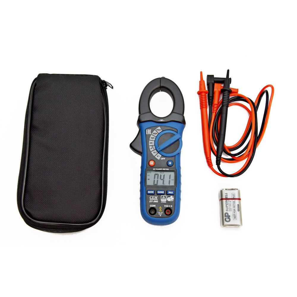 Токоизмерительные клещи DT-360 — удобное устройство для измерения переменного тока до 400 А и сопротивления до 20 Мом. В комплектацию добавлены щупы — без контакта с проводником проверят переменное напряжение в пределах до 600 Ват. Как и другие токоизмерительные устройства, способны провести проверку диодов и обнаружить обрыв линии в электрической цепи. Работает с разрешением по току в 1 Ма.