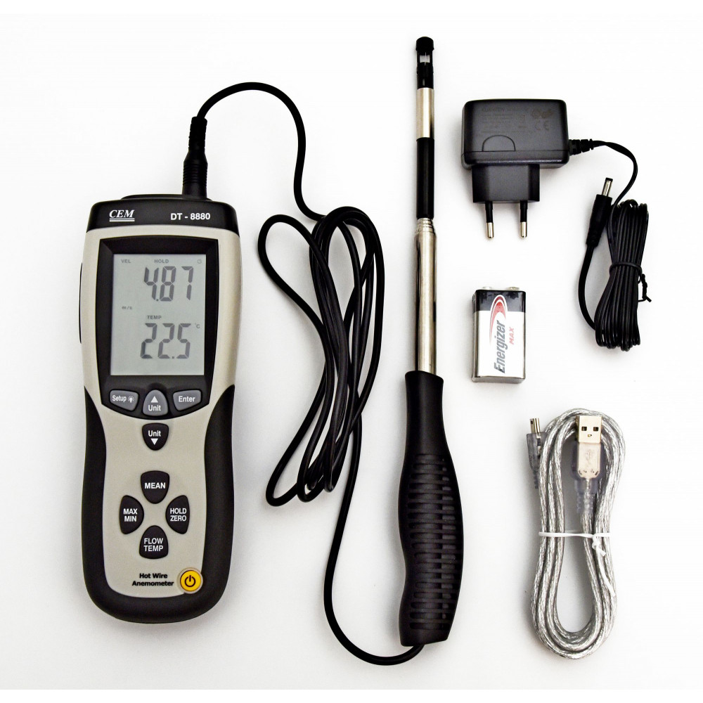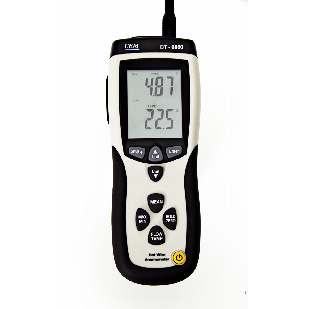 Анемометр CEM DT-8880 — это компактное цифровое устройство. Его используют для получения замеров минимальных скоростей движений воздуха. Также он пригодится для получения данных или контроля параметров вентиляционных систем и систем кондиционирования.