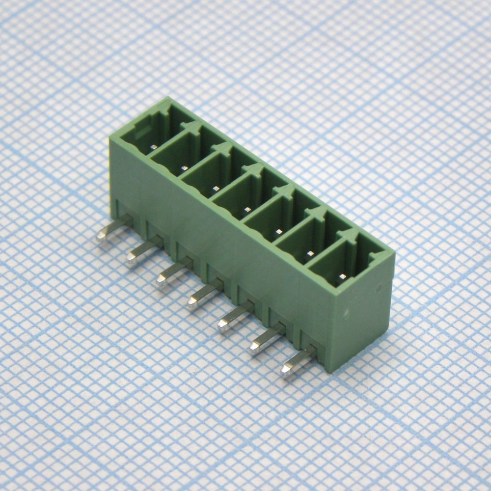 Вилочный разъем, горизонтальный, на плату, шаг: 3.5 мм, 7 полюсов, фиксация на плате пайкой, исполнение: стандартное, 160V, 8A, цвет: зеленый