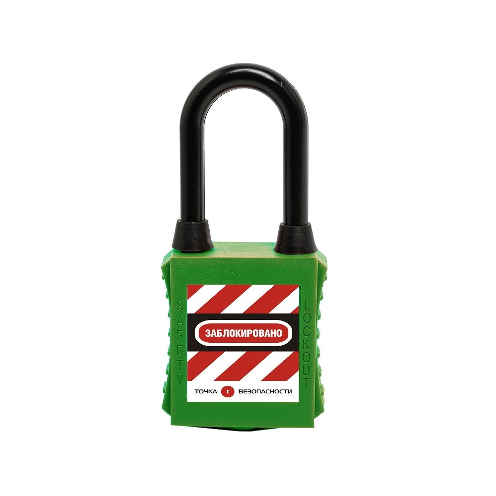 Замок блокировочный с нейлоновой дужкой и пылезащитой, дисковый цилиндр, высота дужки – 38 мм, диаметр дужки – 6.2 мм, нейлоновый корпус, размеры корпуса – 45х38х20 мм, цвет – зеленый, 1 шт/упак