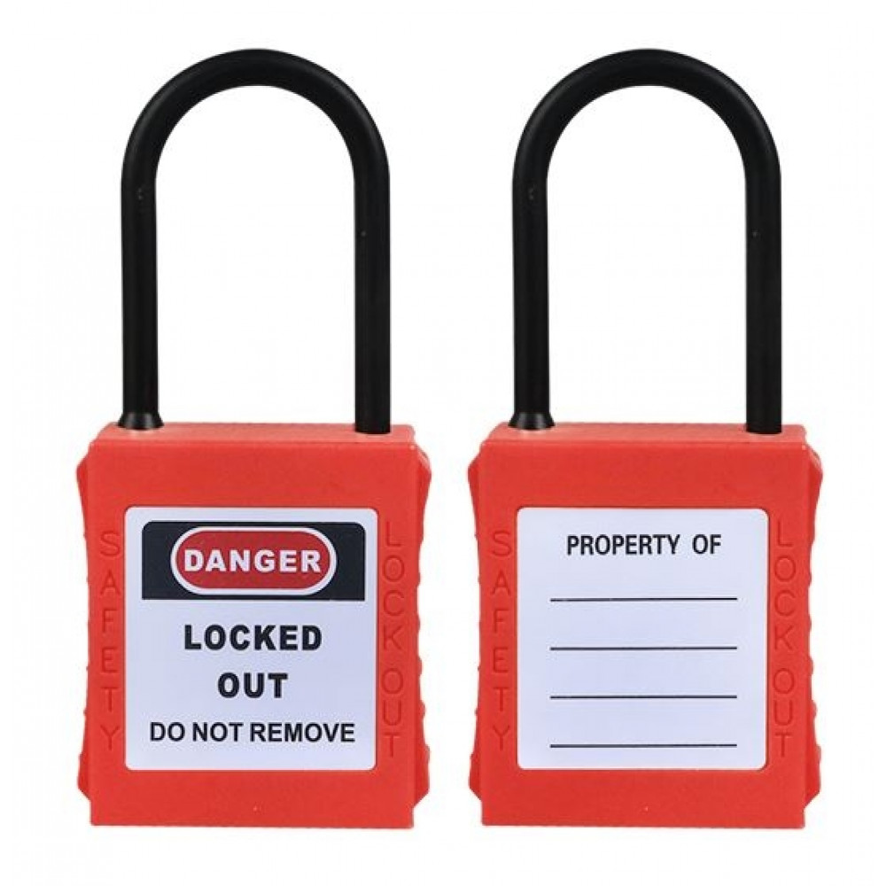 gwr005DN38RED, Замок блокировочный с тонкой нейлоновой дужкой, дисковый цилиндр, высота дужки – 38 мм, диаметр дужки – 4 мм, сварной корпус из ABS-пластика, размеры корпуса – 45х40х20 мм, цвет – красный, 1 шт/упак