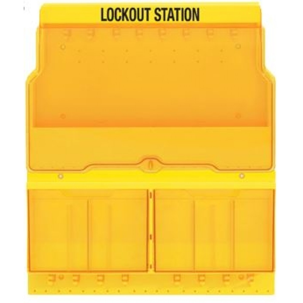 Станция блокировочная пластиковая закрытая, 16 держателей для замков, 3 отсека для блокираторов и 2 кармана для бирок, поликарбонат, 574х680х108 мм, цвет – желтый, 1 шт/упак