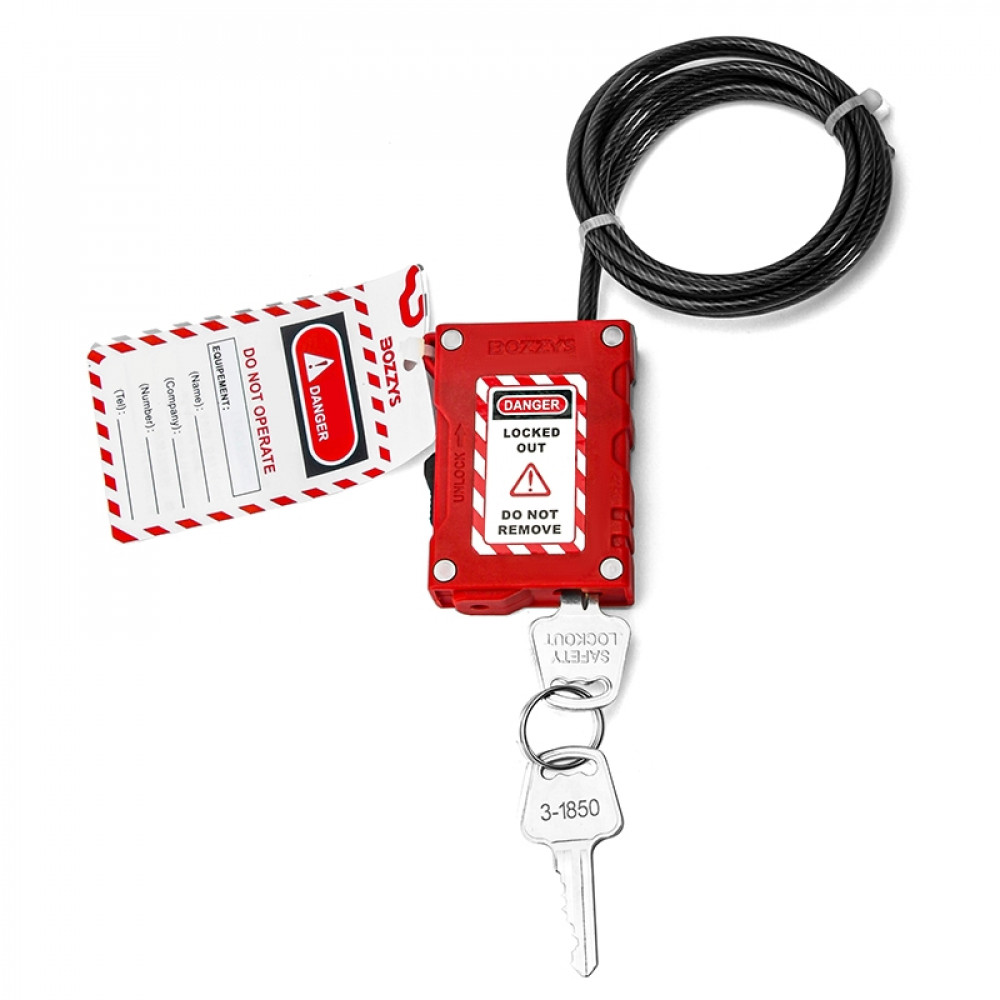 Тросовый блокиратор-замок, пиновый цилиндр, стальной трос в ПВХ-оболочке, длина троса – 0.8 м, диаметр троса – 3 мм, нейлоновый корпус, размеры корпуса – 67х47.7х18.2 мм, цвет корпуса – красный, 1 шт/упак