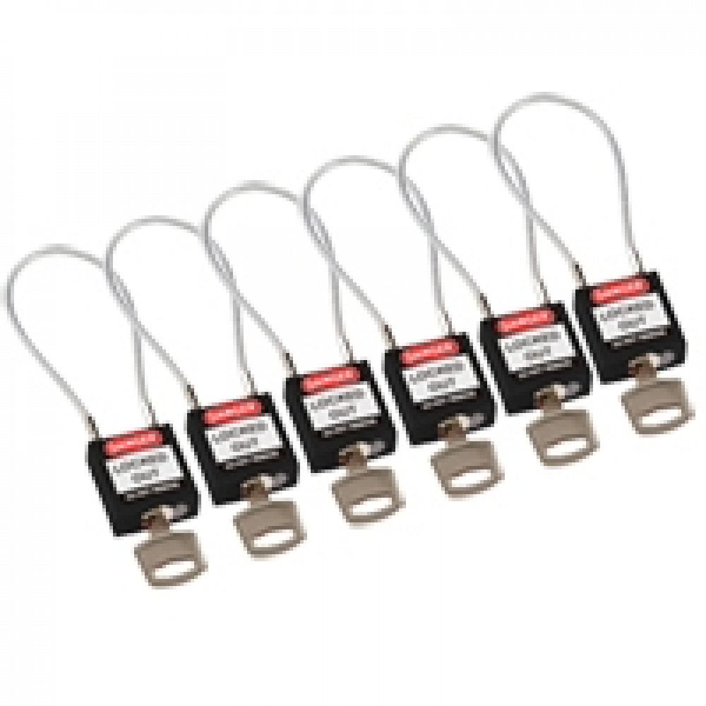 gws195980, Замки нейлоновые компактные с гибкой дужкой, дужка – стальной трос в виниловой оболочке, высота дужки – 107 мм, диаметр дужки – 4.7 мм, нейлоновый корпус, размеры корпуса – 35х32х16 мм, цвет – черный, 6 шт/упак