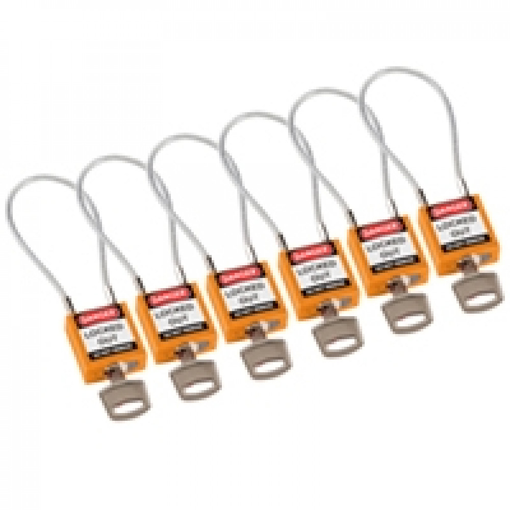 gws195983, Замки нейлоновые компактные с гибкой дужкой, дужка – стальной трос в виниловой оболочке, высота дужки – 107 мм, диаметр дужки – 4.7 мм, нейлоновый корпус, размеры корпуса – 35х32х16 мм, цвет – оранжевый, 6 шт/упак