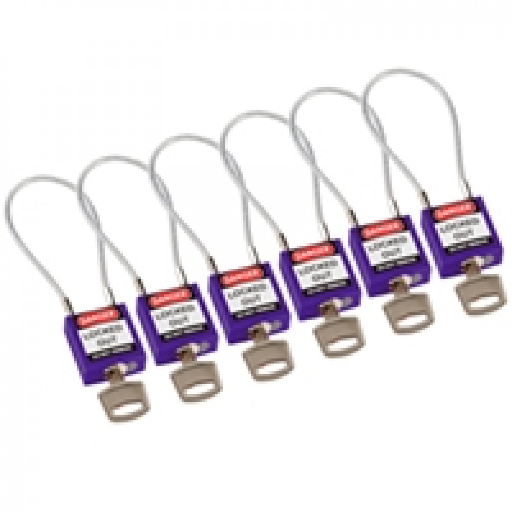 gws195984, Замки нейлоновые компактные с гибкой дужкой, дужка – стальной трос в виниловой оболочке, высота дужки – 107 мм, диаметр дужки – 4.7 мм, нейлоновый корпус, размеры корпуса – 35х32х16 мм, цвет – фиолетовый, 6 шт/упак