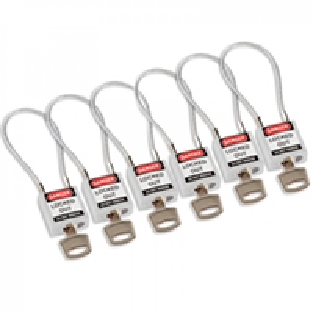 gws195985, Замки нейлоновые компактные с гибкой дужкой, дужка – стальной трос в виниловой оболочке, высота дужки – 107 мм, диаметр дужки – 4.7 мм, нейлоновый корпус, размеры корпуса – 35х32х16 мм, цвет – белый, 6 шт/упак