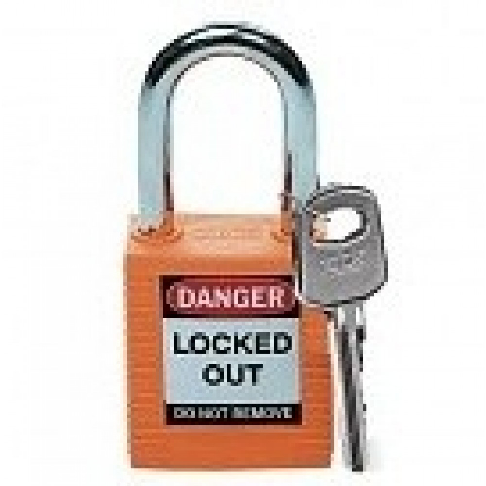 Замки нейлоновые со стальной дужкой, высота дужки – 38 мм, диаметр дужки – 6.5 мм, нейлоновый корпус, размеры корпуса – 45х38х20 мм, цвет – оранжевый, 6 шт/упак