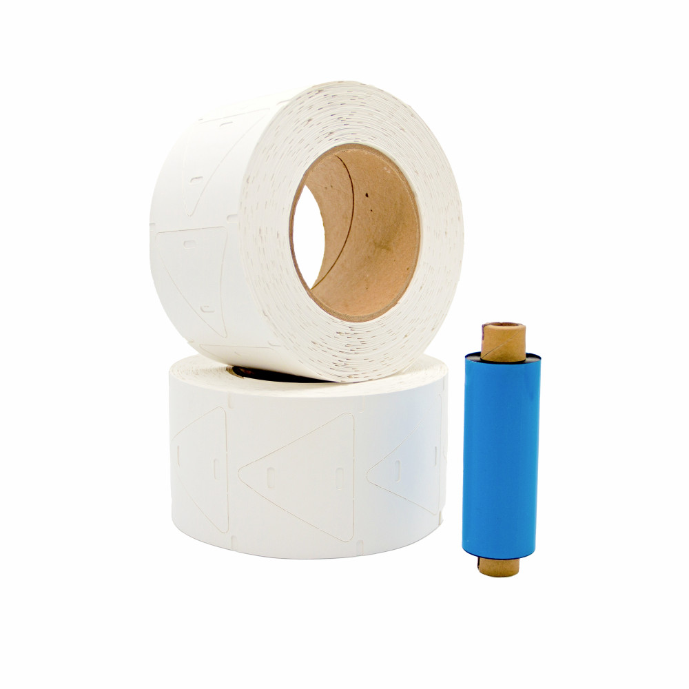 Комплект для маркировки кабеля: бирка У-136 (форма-треугольник), материал - полипропилен, размер 55х60 мм, 1000 шт. (2 рулона по 500 шт.); риббон Resin, цвет - черный, втулка 25.4мм