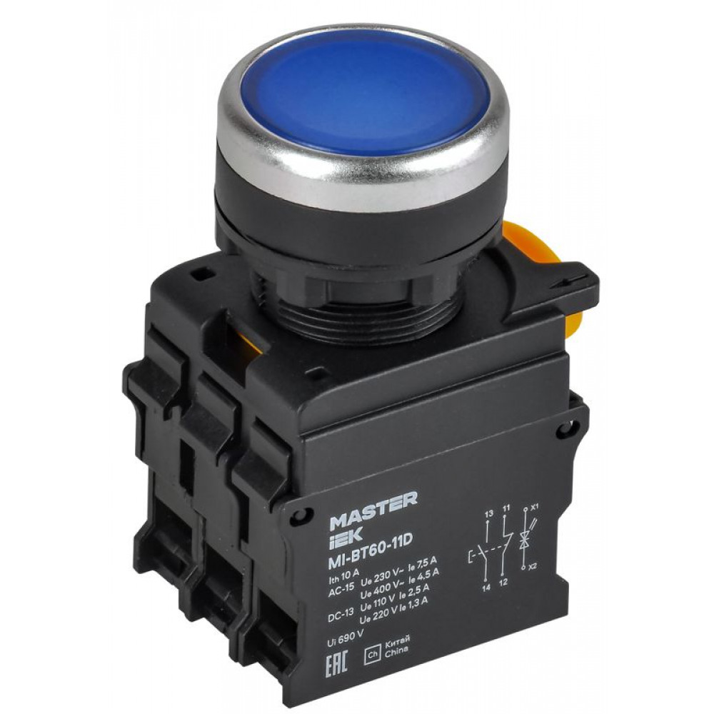Кнопка с подсветкой d=22мм 1NO+1NC синяя MASTER IEK MI-BT60-11D-3-12-K07, Кнопка