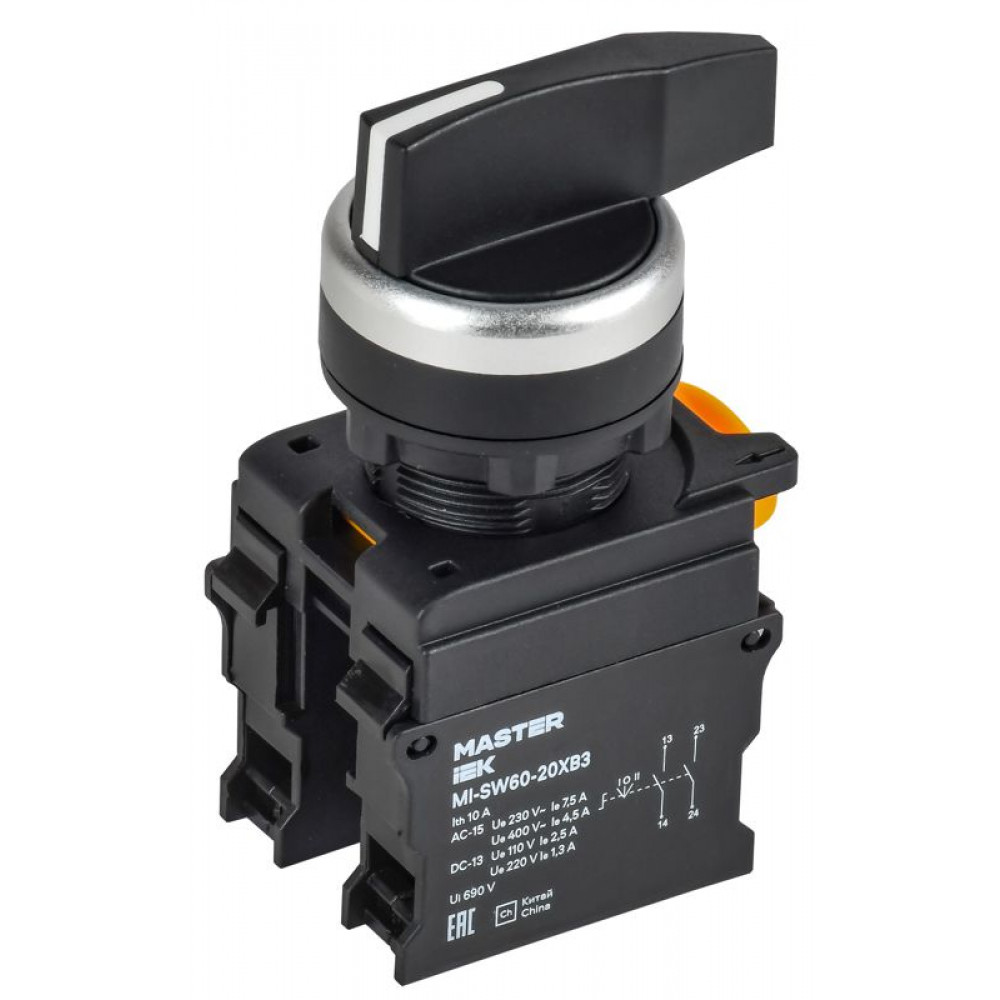 Описание Переключатель длин. ручка 3 полож. 2NO ч-рный MASTER IEK MI-SW60-20XB3-4-25-3-K02
