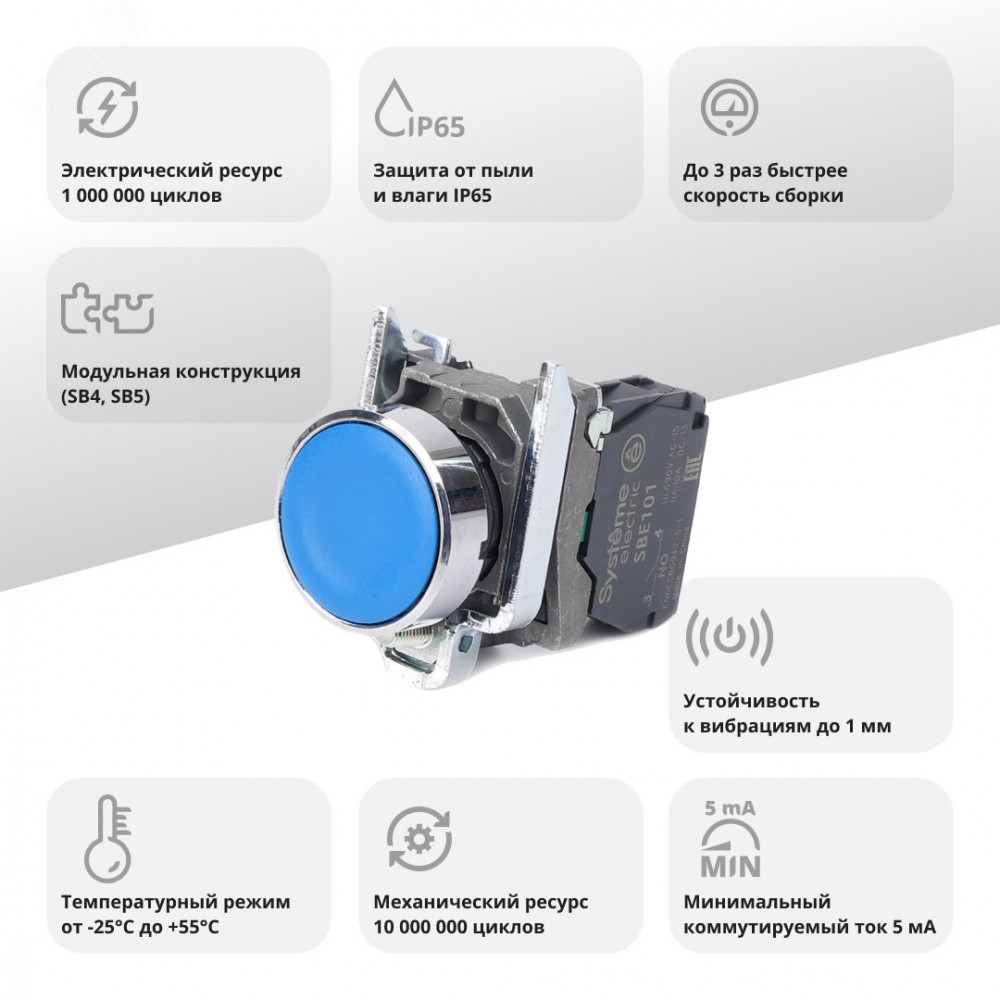 Описание Кнопка SB4 в сборе модульная 22мм синяя с возвратом металл 1НО SB4BA61