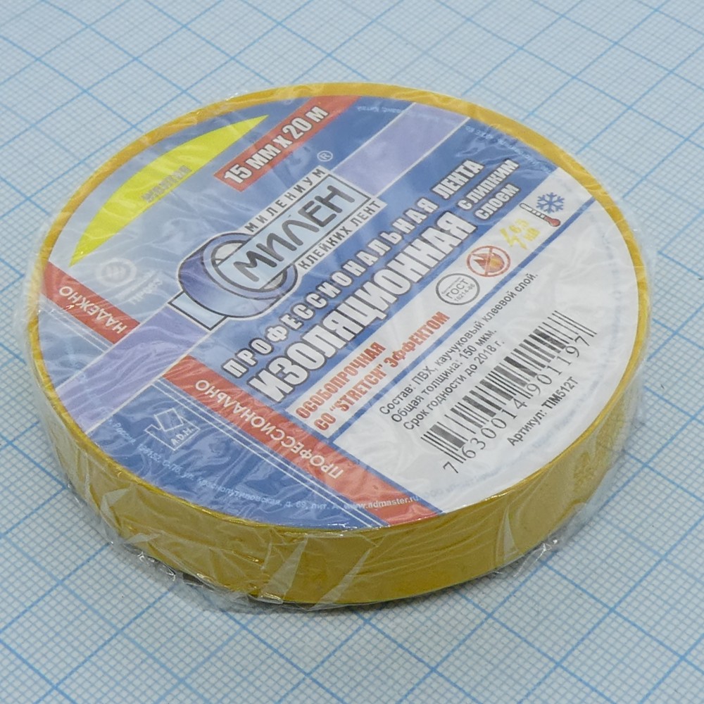 Изолента Милен ПВХ 15мм*20м желтая, лента изоляционная представляет собой изоляционный материал, сделанный на основе поливинилхлорида.